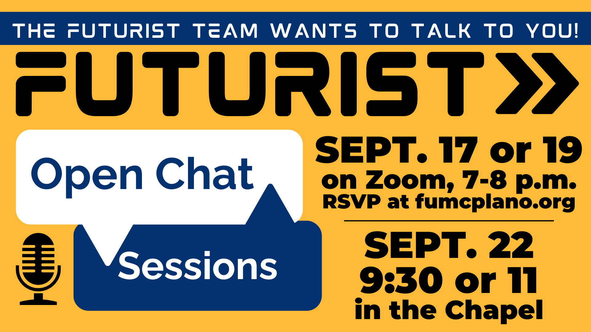 These Open Chat Sessions will be via Zoom at 7 p.m. on Tuesday, Sept. 17, and Thursday, Sept. 19. Click HERE to sign up and receive the Zoom Link. There will also be two in-person Open Chat Sessions on Sunday, Sept. 22, at 9:30 and 11 a.m. No need to RSVP for those; just come to the Chapel.